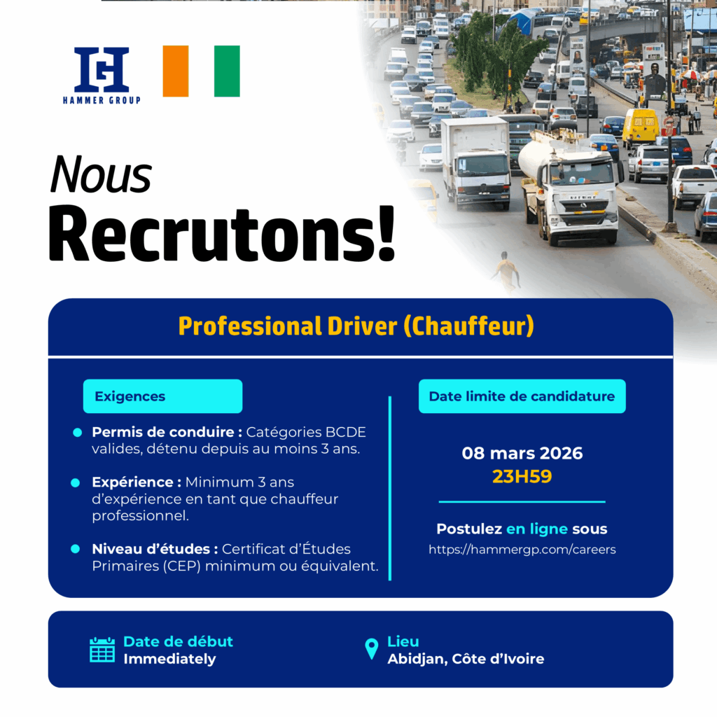 - Location: Hammer Group Côte d’Ivoire Headquarters, Port-Bouët (behind Wharf), Cité SIPIM, Sirène entrance, Abidjan.